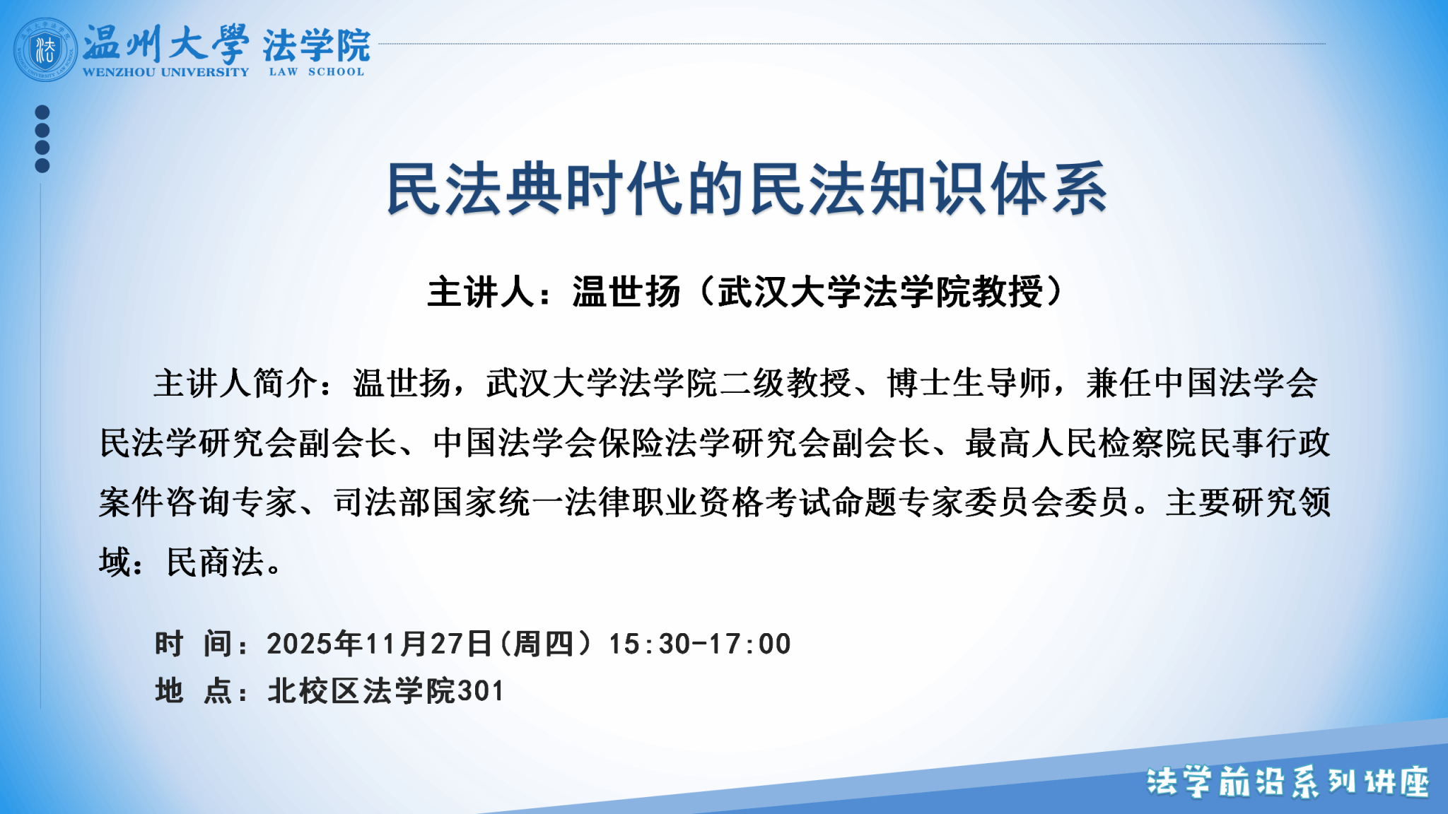 讲座预告|法学前沿讲座第三期第7讲:民法典时代的民法知识体系(11月27日)