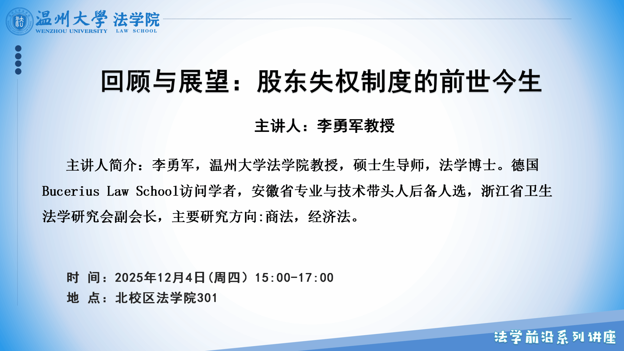 讲座预告|法学前沿讲座第三期第8讲:回顾与展望:股东失权制度的前世今生(12月4日)