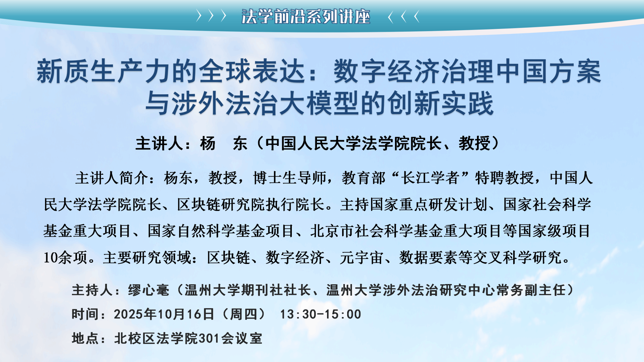 讲座预告|法学前沿讲座第三期第3讲:新质生产力的全球表达:数字经济治理中国方案与涉外法治大模型的创新实践