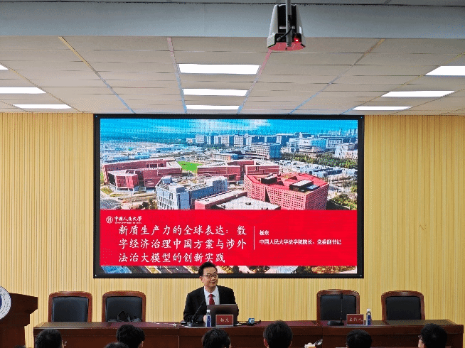 2025年10月16日下午,中国人民大学法学院院长、长江学者特聘教授杨东应邀在温州大学北校区法学院301教室作题为《新质生产力的全球表达:数字经济治理中国方案与涉外法治大模型的创新实践》的专题讲座。本次讲座由温州大学期刊社社长缪心毫主持,内容跨越法学、经济学与计算机科学等多个领域,吸引了众多师生积极参与。