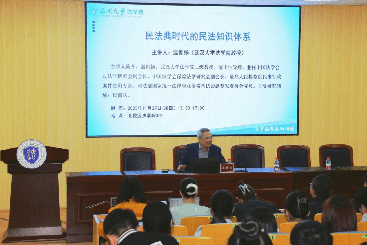 2025年11月27日下午,武汉大学法学院二级教授、博士生导师温世扬教授,应邀在温州大学北校区法学院301会议室作题为“民法典时代的民法知识体系”的专题讲座。讲座由法学院王宗正教授主持,吸引了众多师生到场聆听,现场气氛热烈。