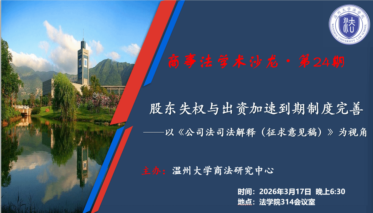 2026年3月17日晚18:30,由温州大学商法研究中心主办的“商事法学术沙龙”第24期在法学院314会议室如期举行。本次沙龙的主题为“股东失权与出资加速到期制度完善——以《公司法司法解释(征求意见稿)》为视角”,活动由张可奕同学主持,温州大学商法研究中心主任李勇军教授作为点评人参与沙龙活动。