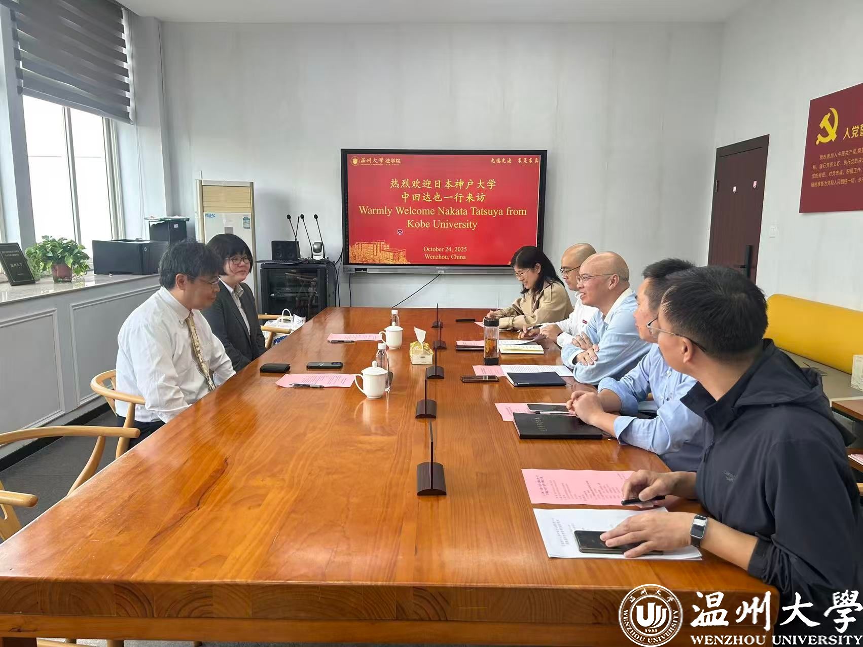 10月25日,日本神户大学中田达也副教授、青木望美研究员一行应邀访问温州大学法学院,双方围绕法学人才培养、科研交流与国际合作开展了座谈交流。学院院长王宗正、党委书记周敬业、党委副书记郑兆钧及国际法系主任李京普、白亚宁博士等参加座谈。
