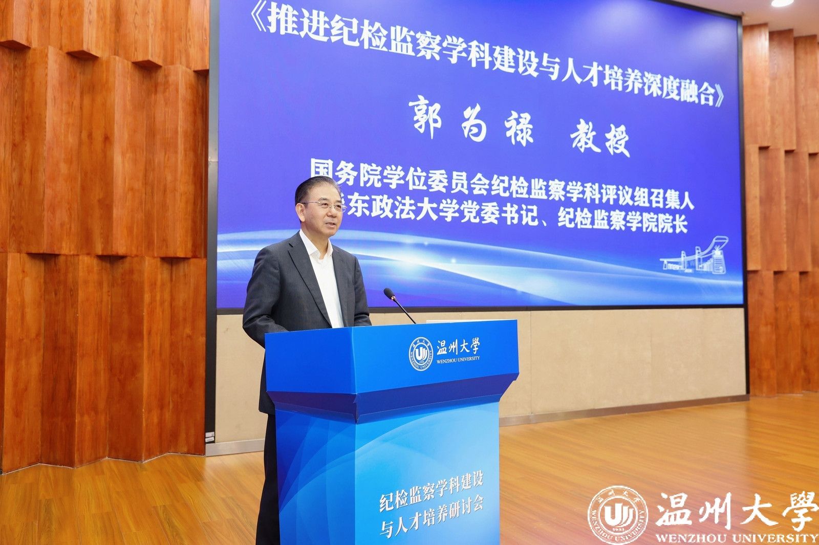 2025年11月8日,由温州大学主办,温州大学法学院、清廉温州研究中心承办的“纪检监察学科建设与人才培养研讨会”在温州大学岩松堂隆重召开。国务院学位委员会纪检监察学科评议组召集人、华东政法大学党委书记郭为禄,浙江省教育厅党组成员、省纪委监委驻省教育厅纪检监察组组长、省纪检监察协会副会长王健,国务院学位委员会纪检监察学科评议组成员、复旦大学纪检监察研究院执行院长刘志刚,苏州大学国家监察研究院院长、王健法学院教授李晓明,温州市纪委常务副书记、市监委副主任龚大昕,温州大学校领导钱强、刘玉侠、李都金,以及华东政法大学、苏州大学、东南大学、南京大学、西南政法大学等全国47所高校、科研院所的百余位专家学者,温州市纪委监委等实务部门与行业代表、温州大学师生代表齐聚一堂,围绕纪检监察学科与人才培养深度融合展开高峰对话。研讨会开幕式由刘玉侠主持。