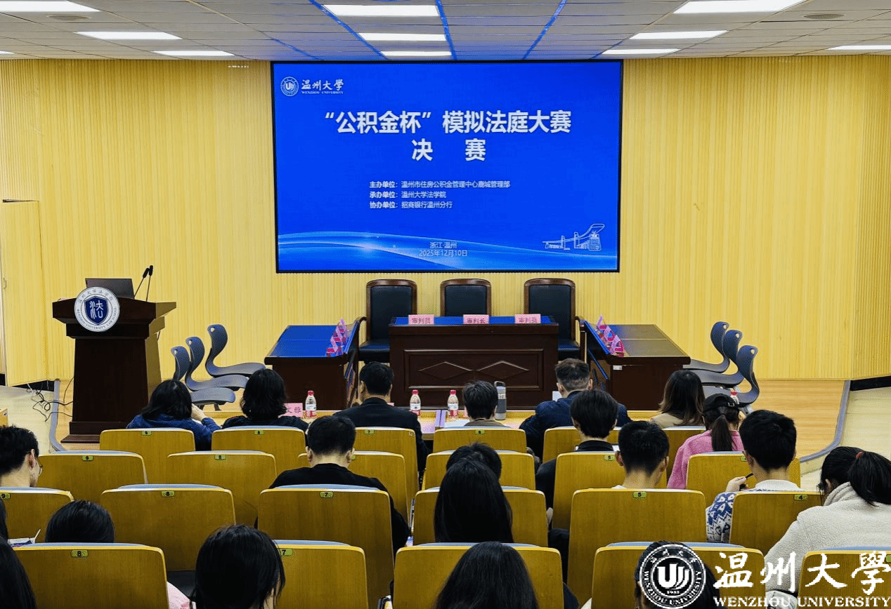 2025年12月10日下午,由温州市住房公积金管理中心鹿城管理部主办,温州大学法学院承办,招商银行温州分行协办的“公积金杯”模拟法庭大赛在温州大学北校区顺利举办。温州大学法学院副院长周一颜、鹿城区人民法院行政审判庭庭长麻永和、浙江光正大律师事务所专职律师姜亚静、北京盈科(温州)律师事务所专职律师李小丹、主办协办单位代表,以及温州大学师生共计100余人观摩了本次比赛。