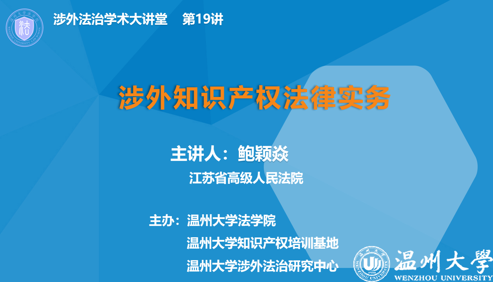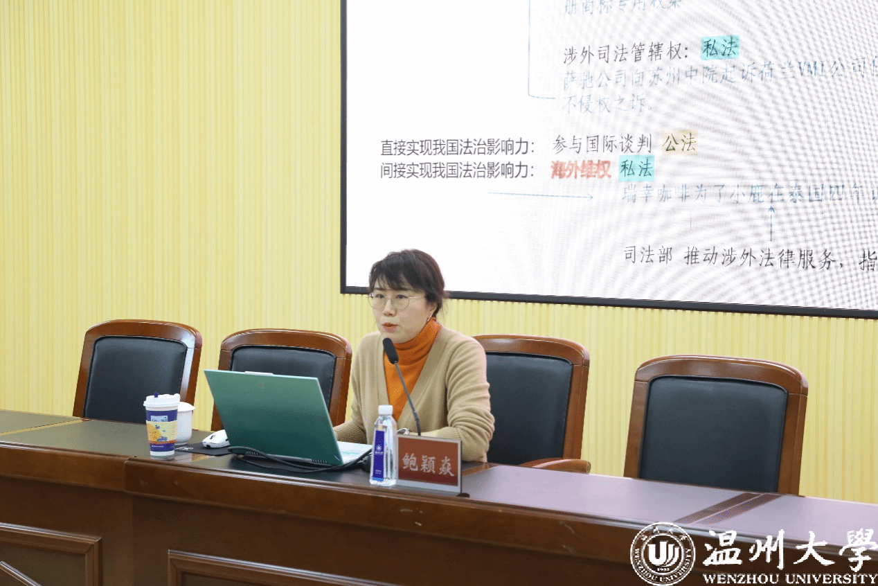 2025年12月29日下午,我院涉外法治论坛系列活动之第十九讲在法学院301会议室顺利举办。本次讲座特邀江苏省高级人民法院三级高级法官鲍颖焱主讲,以《涉外知识产权法律实务》为主题,为师生带来知识产权前沿实务分享。讲座由国际法系主任李京普主持,学院众多学子及国际法系多位教师参加。