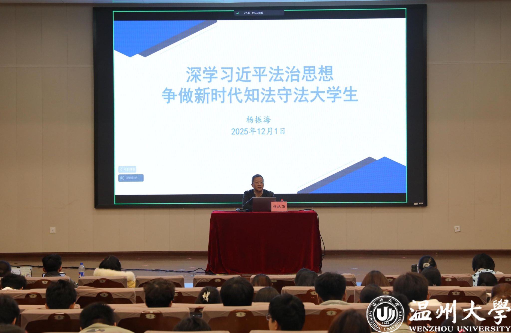 最后,杨老师结合近年发生在身边的案例,详细讲解了日常生活中的法治防范要点,提醒同学们在使用网络社交软件时不谈论敏感话题、不随意共享个人信息、不参与非法交易,切实增强风险防范意识。另外,杨老师还向同学们介绍了温州大学在法治思想传播方面的积极探索,包括习近平法治思想研究会的课题研究、微宣讲以及“习近平法治思想”宣传月等系列活动,这些活动为学子们搭建了学习实践的广阔平台。