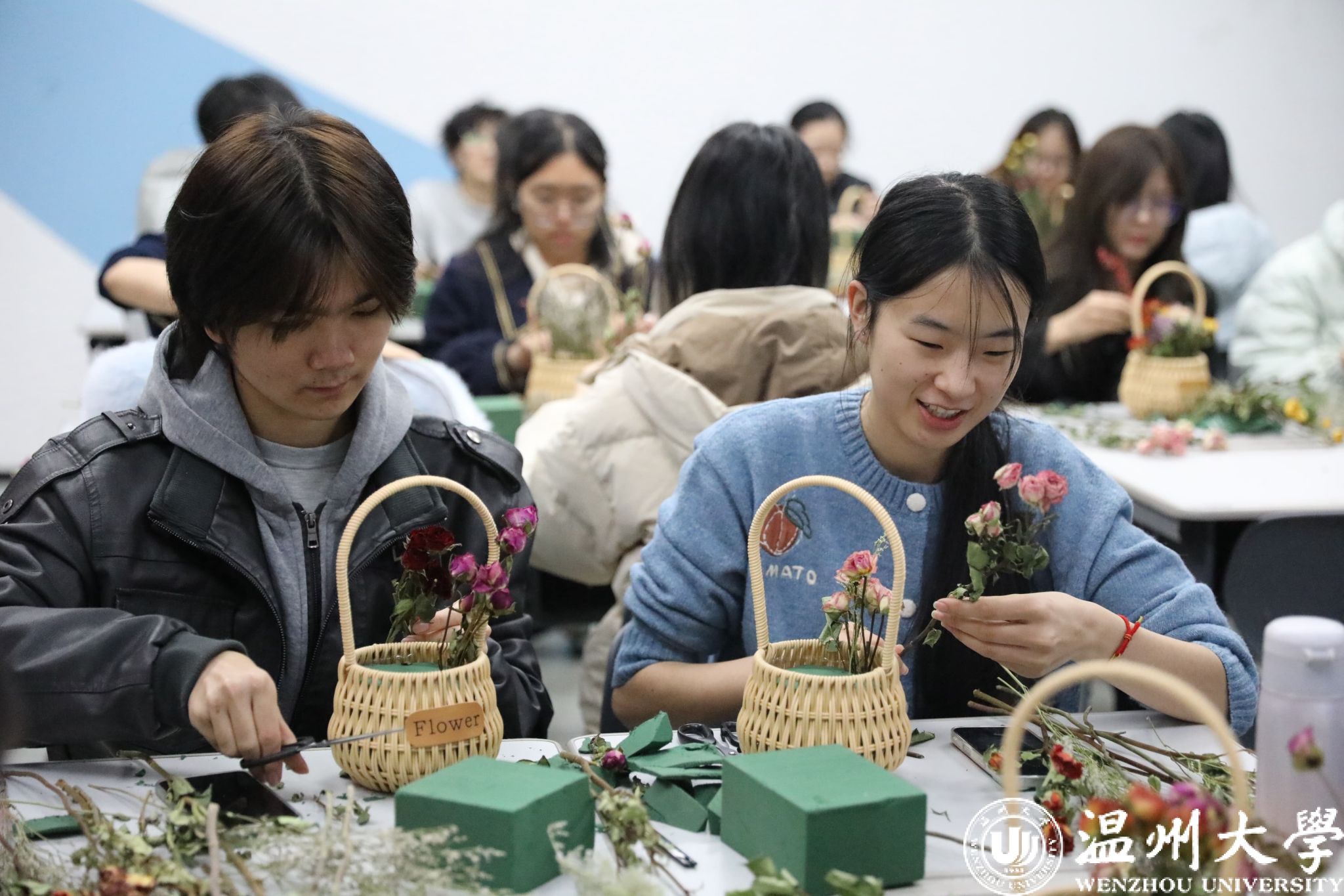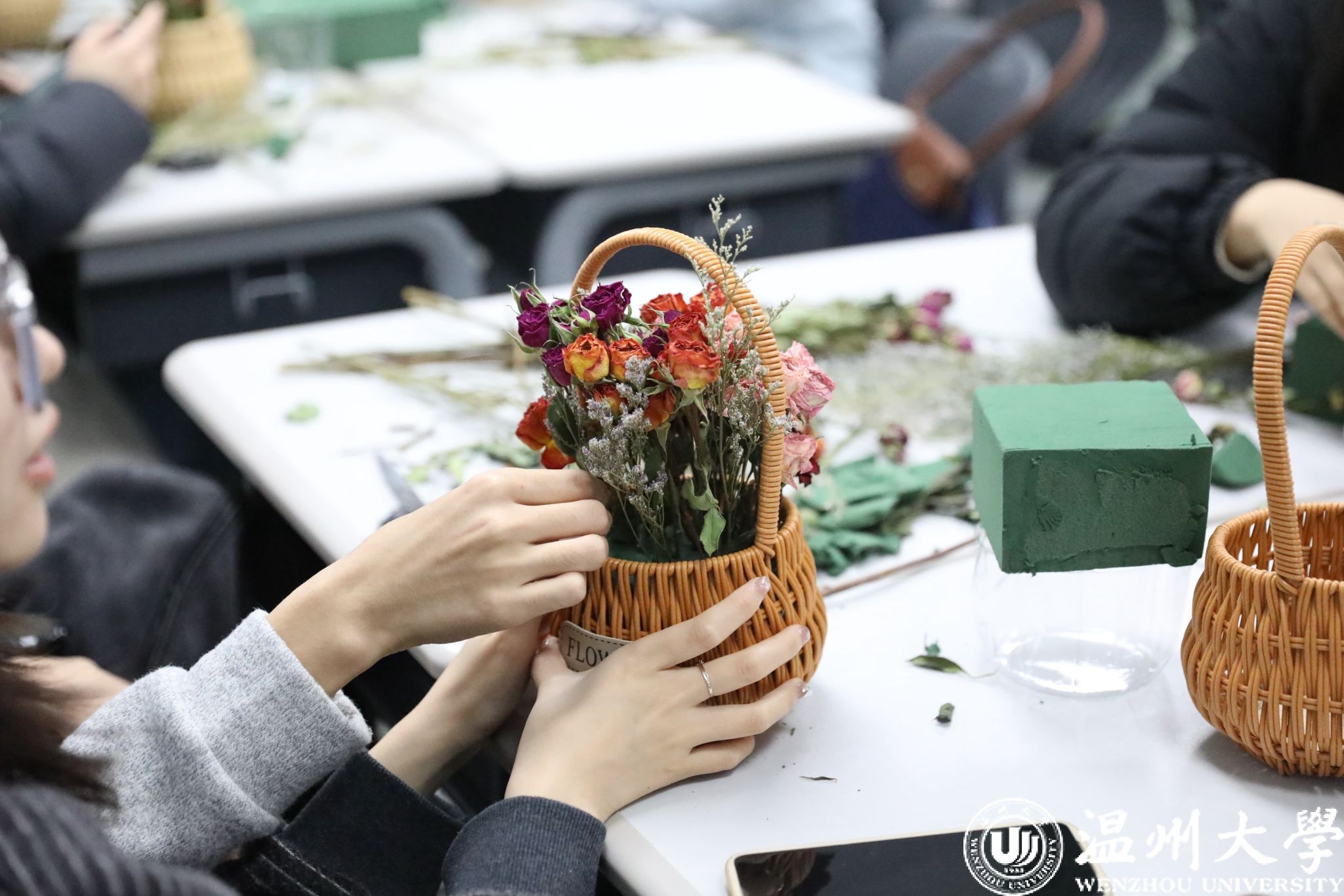 活动伊始,大家共同围在桌旁。面前摆着的是各式藤编花篮、鲜花、干花与精致配饰,色彩柔和,清新雅致,宛如一阕尚未谱写的诗,静待各位师生以灵巧的双手将其续写。